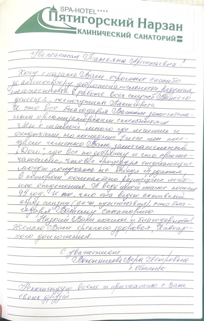 Только благодаря вам, вашему упорству, трудолюбию и безграничной любви к людям, мы имеем прекрасный санаторий под названием «Пятигорский нарзан!».