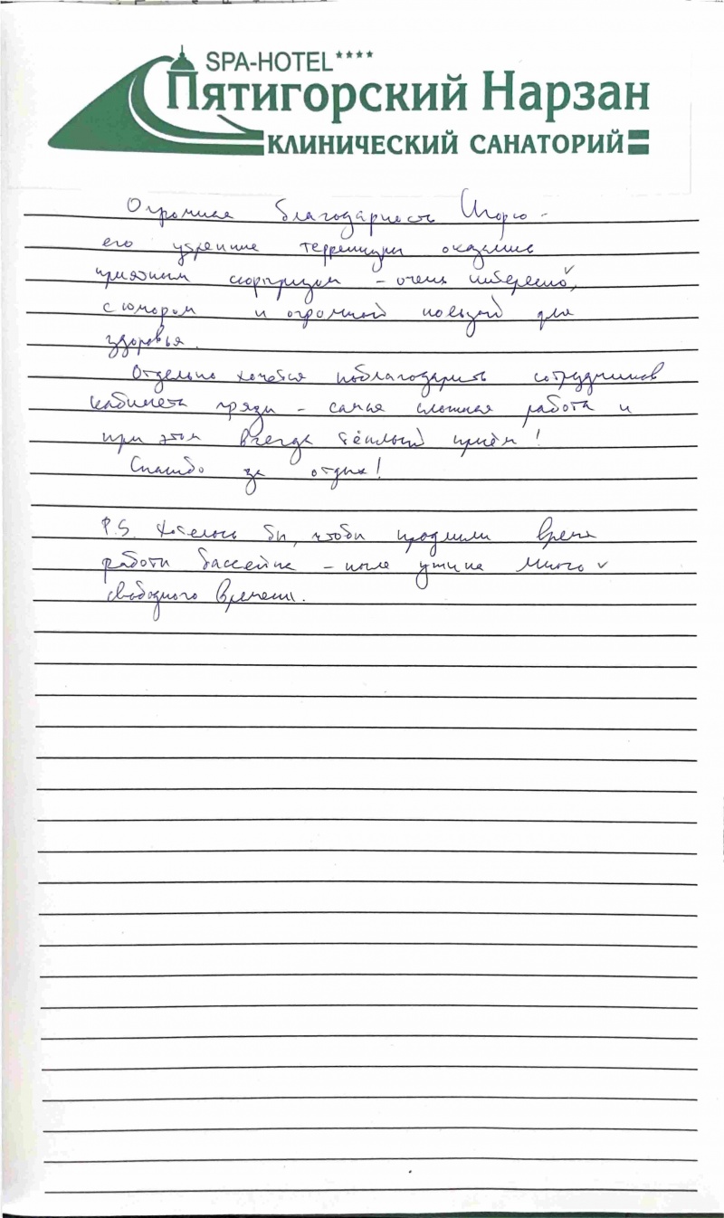Хочу сказать Вам огромное спасибо за атмосферу доброжелательности, радушия, слаженность в работе всех служб Вашего детища, жемчужины Пятигорска.