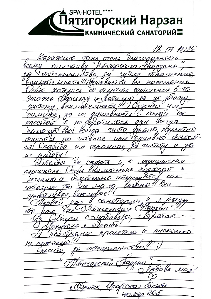 Выражаю благодарность всему коллективу «Пятигорского нарзана», за гостеприимство, за чуткое отношение, внимательность!!! Учитываются все пожелания. Особо хотелось бы отметить горничных 6-го этажа Татьяну и Наталью за их заботу, чистоту, внимательность!!! Спасибо им большое, за их душевность! С какой бы просьбой я не обратилась они всегда помогут! Все всегда чисто, убрано, корректно относятся, но главное — они душевно относятся. Спасибо им огромное, за чистоту и за их работу! Хотелось бы сказать и о медицинском персонале. Очень внимательно подходят к лечению и обязательно интересуются, как состояние, что не мало важно! Все приветливые, вежливые! Первый раз в санатории и я рада, что это был «Пятигорский нарзан»!!! Из Сибири с любовью, г.Братск — Иркутская область! Я пол страны пролетела и нисколько не пожалела!!! Спасибо, за гостеприимство!!! «Пятигорский нарзан» Любовь моя!!!