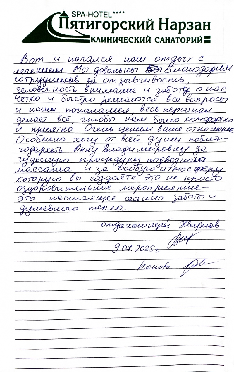 Вот и начался наш отдых с лечением. Мы довольны, благотворим сотрудников за отзывчивость, человечность, внимание и заботу о нас. Четко и быстро решаются все вопросы и наши пожелания, весь персонал делает все, чтобы нам было комфортно и приятно. Очень ценим ваше отношение. Особенно хочу от всей души поблагодарить Анну Владимировну за чудесную процедуру подводного массажа и за особую атмосферу которую вы создаете, это не просто оздоровительное мероприятие — настоящие сеансы заботы и душевного тепла.