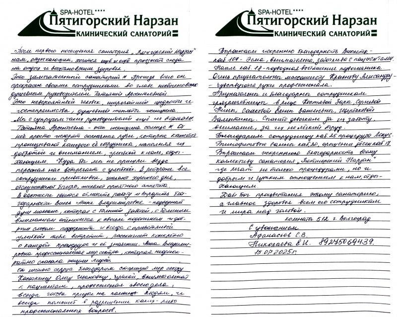 После первого посещения санатория «Пятигорский нарзан» нам, отдыхающим, хочется еще и еще приезжать сюда на отдых и восстановление здоровья. Это замечательный санаторий!!! Прежде всего он прекрасен своими сотрудниками во главе необыкновенного душевного руководителя Татьяны Арсентьевны. Это невероятный человек, широчайшей щедрости и гостеприимства, душевной теплоты женщина. Мы с супругом таких руководителей еще не встречали. Татьяна Арсентьевна — это женщина солнце!!! От нее просто исходят солнечные лучи, которые кажется пронизывают каждого ее сотрудника, наполняя их добротой и вниманием, улыбкой к нам, отдыхающим. Куда бы мы не пришли везде персонал нас встречает с улыбкой. В ресторане все сотрудники приветливые, желают хорошего дня, обслуживают быстро, желают приятного аппетита. В частности хочется отметить работу и выразить благодарность Вилль Анне Владимировне — подводный душ массаж, которая с большой заботой, с большим вниманием относится к своим подопечным и добрым словом поддержит и всегда с приветливой улыбкой тебя встретит, расскажет конкретно с каждой процедуре и ее значения. Анна Владимировна профессиональная мед.сестра, спасала жизни людей. От чистого сердца благодарим старшую мед.сестру Касаткину Ольгу Ивановну, чуткой, внимательной к пациентам, профессионал своего дела, всегда готова прийти на помощь людям и всегда поможет в разрешении каких-либо профессиональных вопросах. Выражаем искреннюю благодарность Виолетте — каб. 104 — Эсма, внимательна, заботлива с пациентами. Наиле каб.18 — подводное вытяжение позвоночника. Очень признательны массажисту Краснову Александру — чувствуются руки профессионала. Признательны и благодарны сотрудникам грязелечебницы в лице Костявой Зары, Сергиной Нины, Сааковой Елены Васильевны, Щербаковой Валентины. Спасибо девочкам за их заботу, внимание, за их нелегкий труд. Благодарим сотрудницу каб. 25 процедура Локус. Бишофитовые ванны каб. 20, орошение десен каб. 17. Выражаем искреннюю благодарность всему коллективу санатория «Пятигорский нарзан» где лечат не только процедурами, но и добрым и чутким отношением к нам, отдыхающим. Дай Бог процветания этому санаторию, а главное здоровья всем его сотрудникам и мира над головой.