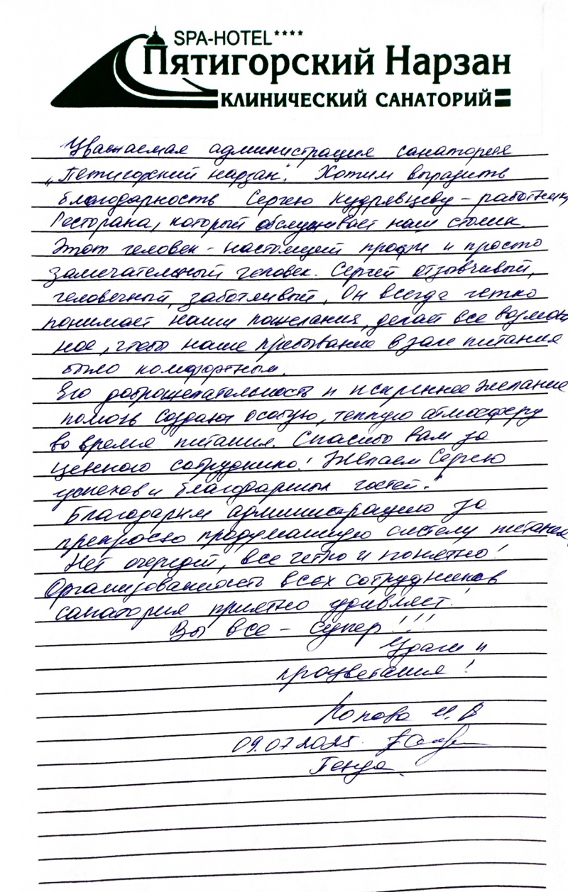 Уважаемая администрация санатория «Пятигорский нарзан». Хотим выразить благодарность Сергею Кудрявцеву — работник ресторана, который обслуживает наш столик. Этот человек настоящий профи и просто замечательный человек. Сергей отзывчивый, человечный, заботливый. Он всегда четко понимает наши пожелания, делает все возможное, чтобы наше пребывание в зале питания было комфортным. Его доброжелательность и искреннее желание помочь создают особую, теплую атмосферу во время питания. Спасибо Вам за ценного сотрудника. Желаем Сергею успехов и благодарных гостей. Благодарим администрацию за прекрасно продуманную систему питания. Нет очередей, все четко и понятно. Организованность всех сотрудников санатория приятно удивляет. Вы все супер. Удачи и процветания.